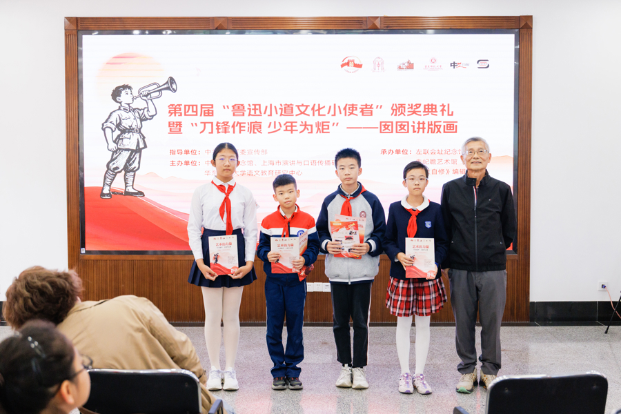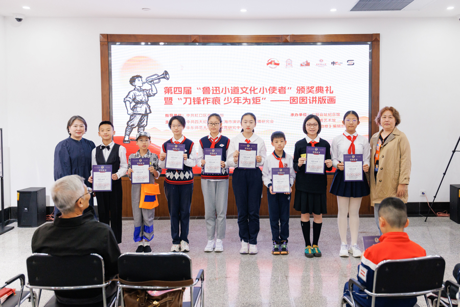 现场,来自沪上多所学校的中小学生获“鲁迅小道文化小使者”称号。孩子们还用歌声与肢体演绎《卖报歌》的故事。