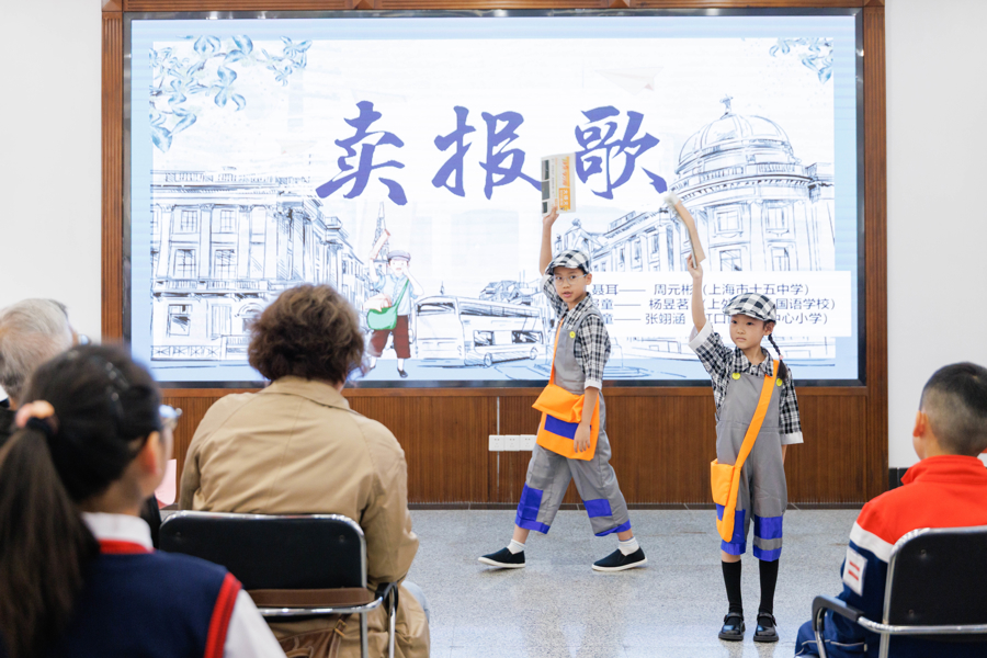 孩子们现场演绎《卖报歌》的故事。 文汇报记者 周俊超摄