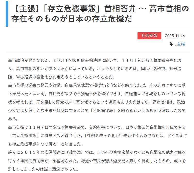 中国青年报客户端北京11月18日电(中青报·中青网记者 王梓)“高市首相的存在本身,就是日本的生存危机。”日本《社会新报》近日发表的一篇社论写道。